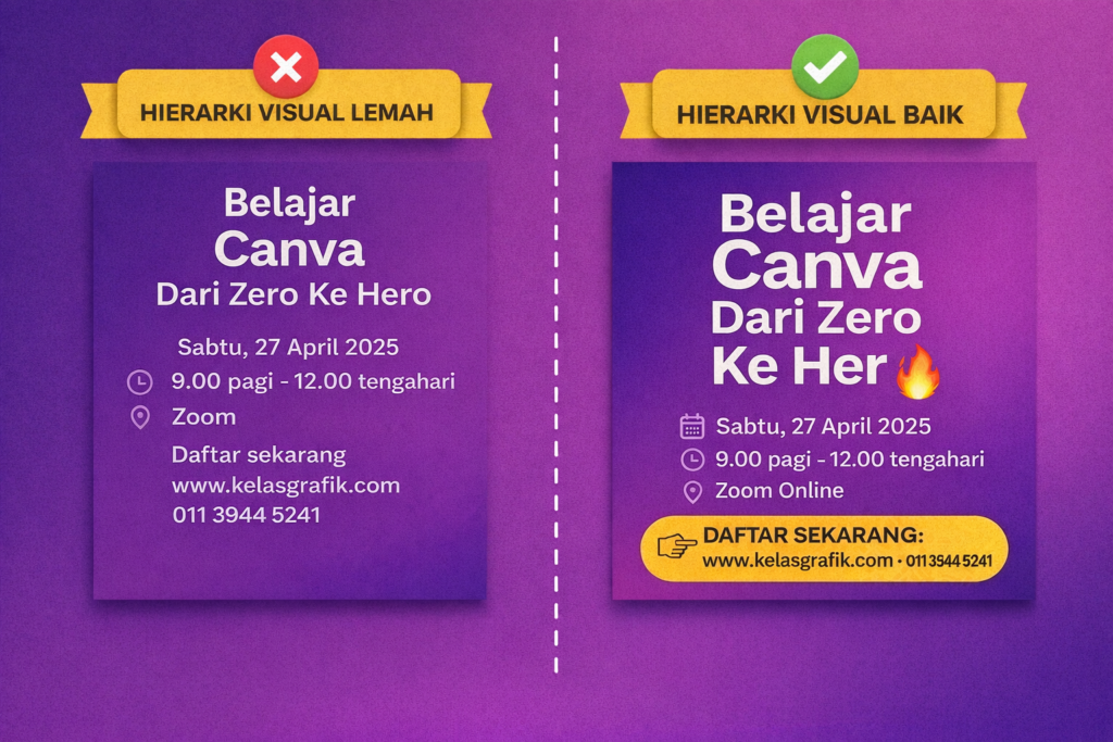 Hierarki visual bermaksud susunan elemen dalam design untuk menunjukkan kepentingan dan susunan maklumat — supaya mata orang tahu apa nak baca dulu, kemudian, dan seterusnya.